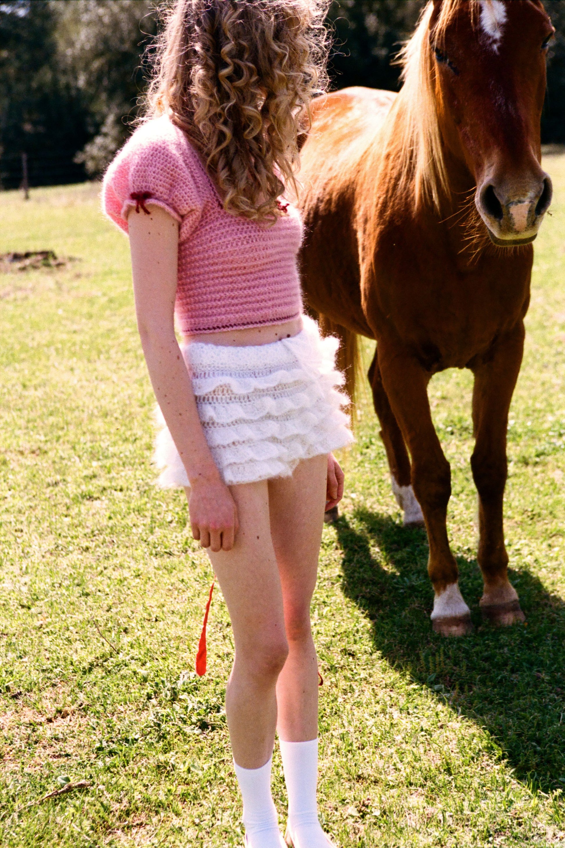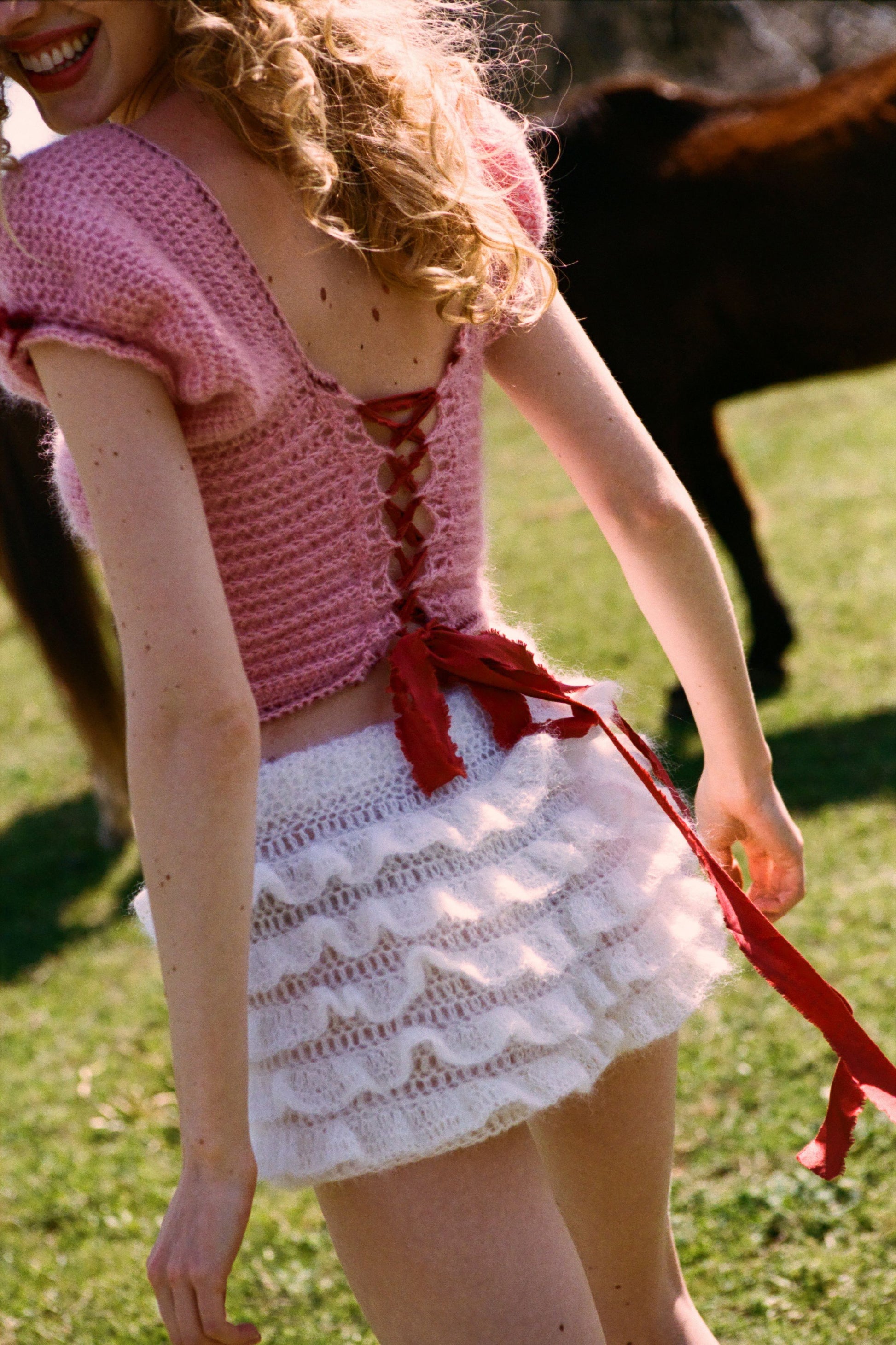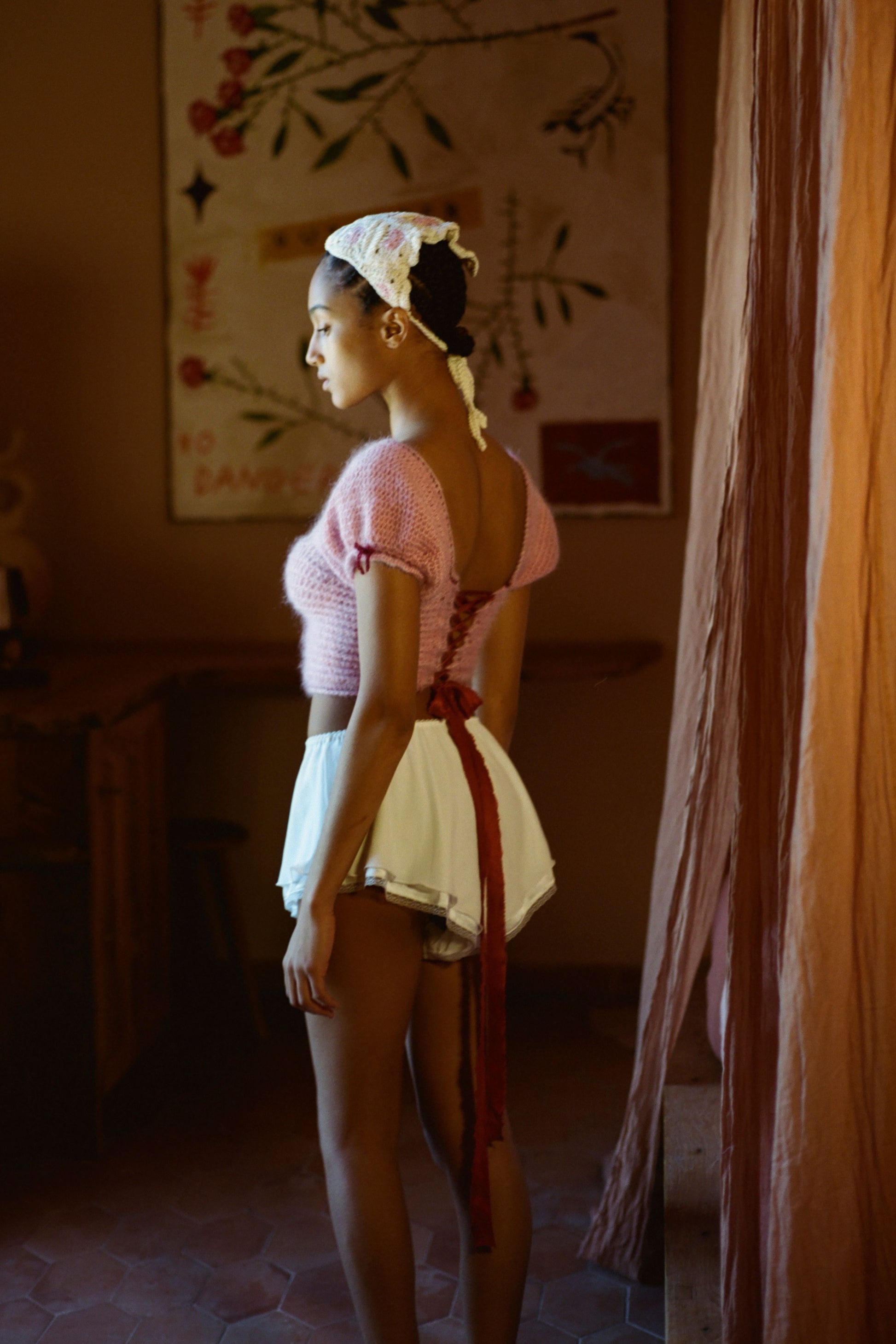The Adeline is a sister to our beloved Amy top, featuring extra details like a contrasting trim, and delicate mohair bows, with a co-ordinating corset back in mulberry silk.