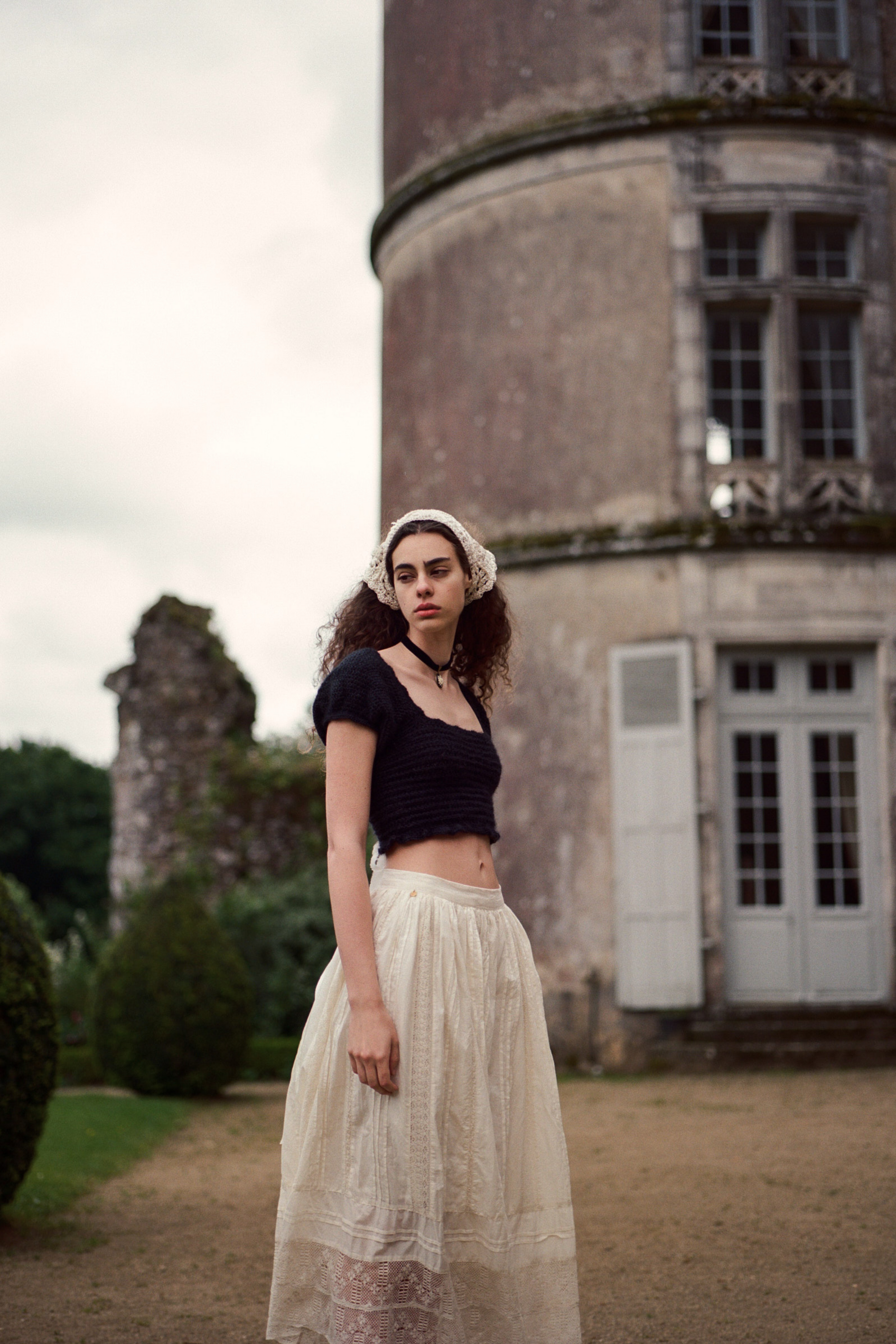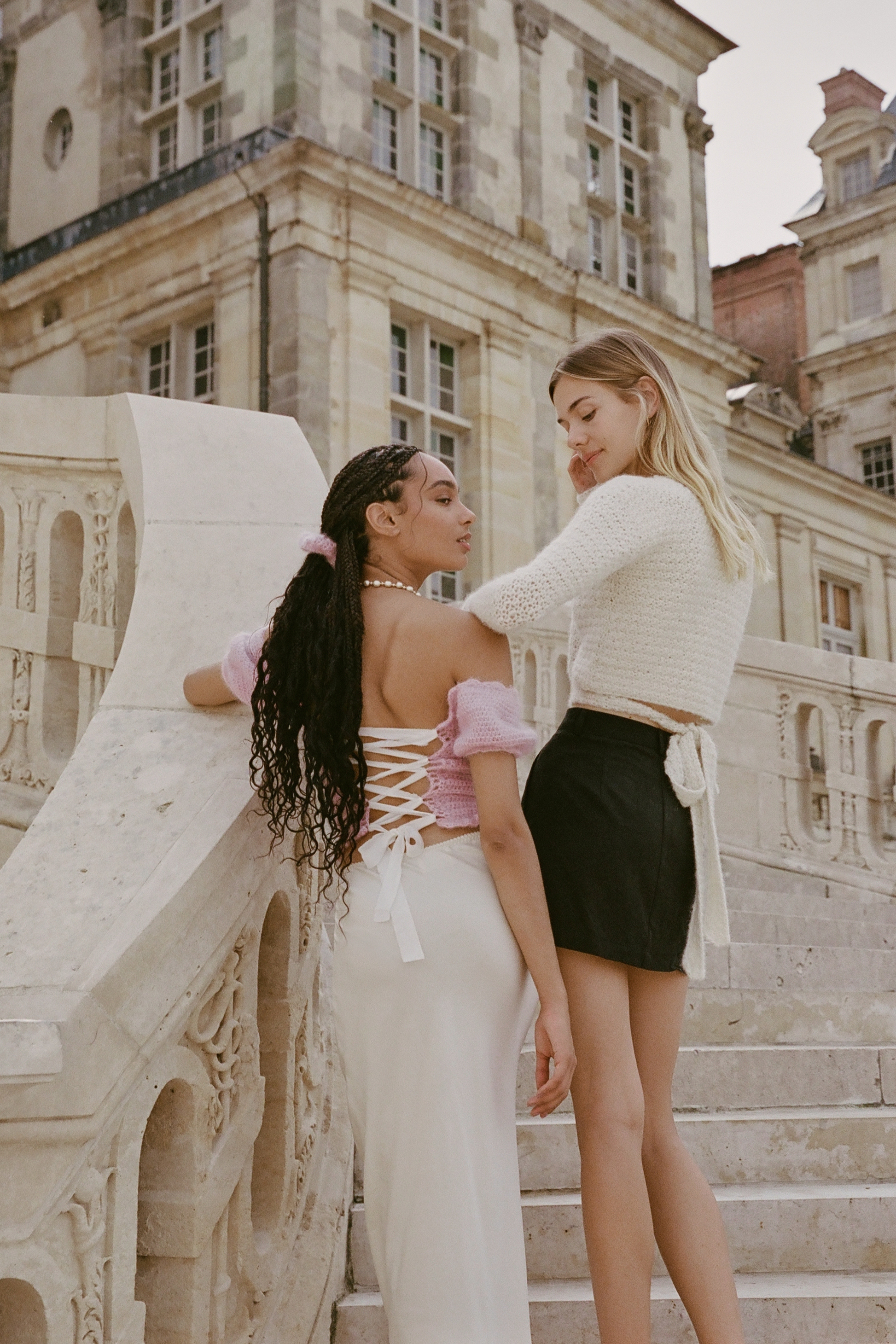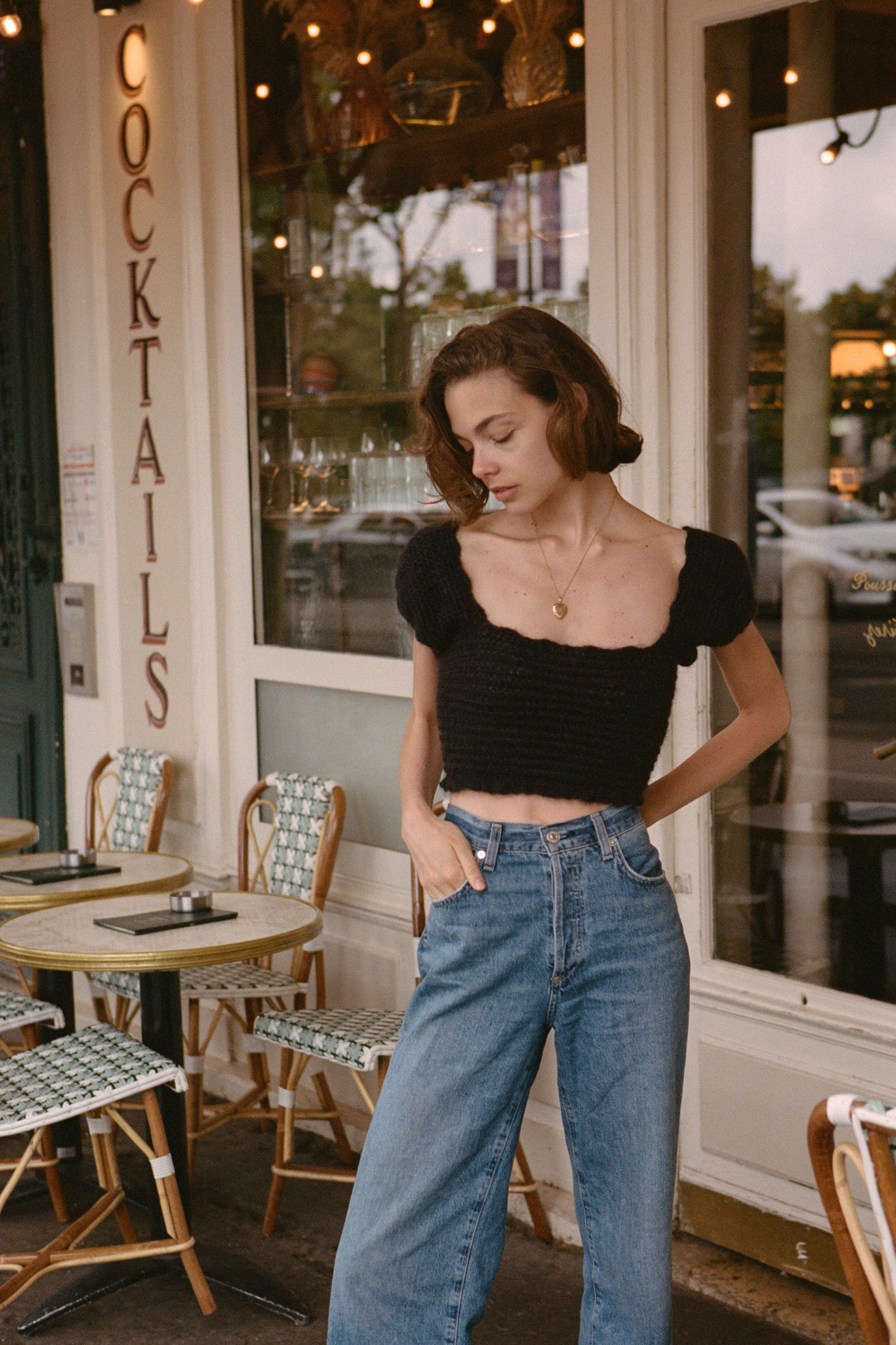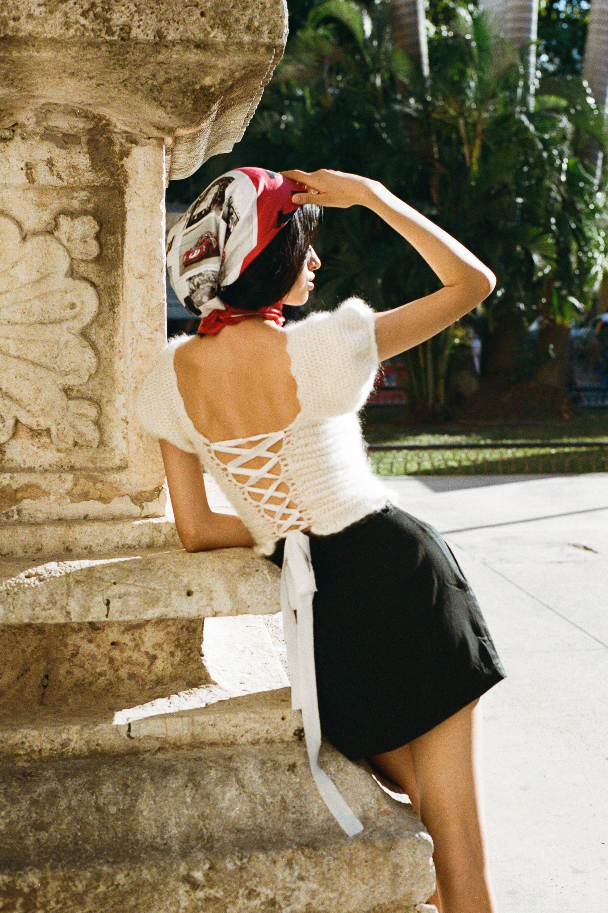 For your modern fairytale. Our newest rendition of the Amy top is thoughtfully designed in a luxurious, whimsical blend of super kid mohair and fine mulberry silk. Featuring dramatic puff sleeves and dainty ruffles with an adjustable corset back in silk charmeuse.