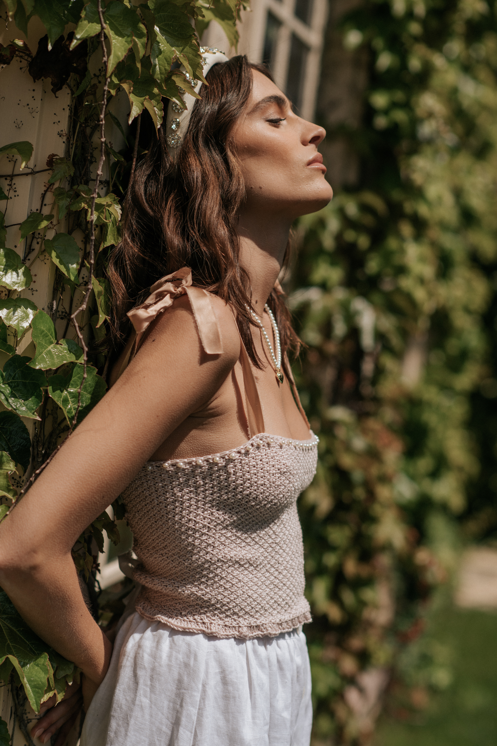 Notre corset élégant et intemporel avec des perles d'eau douce naturelles cousues à la main.