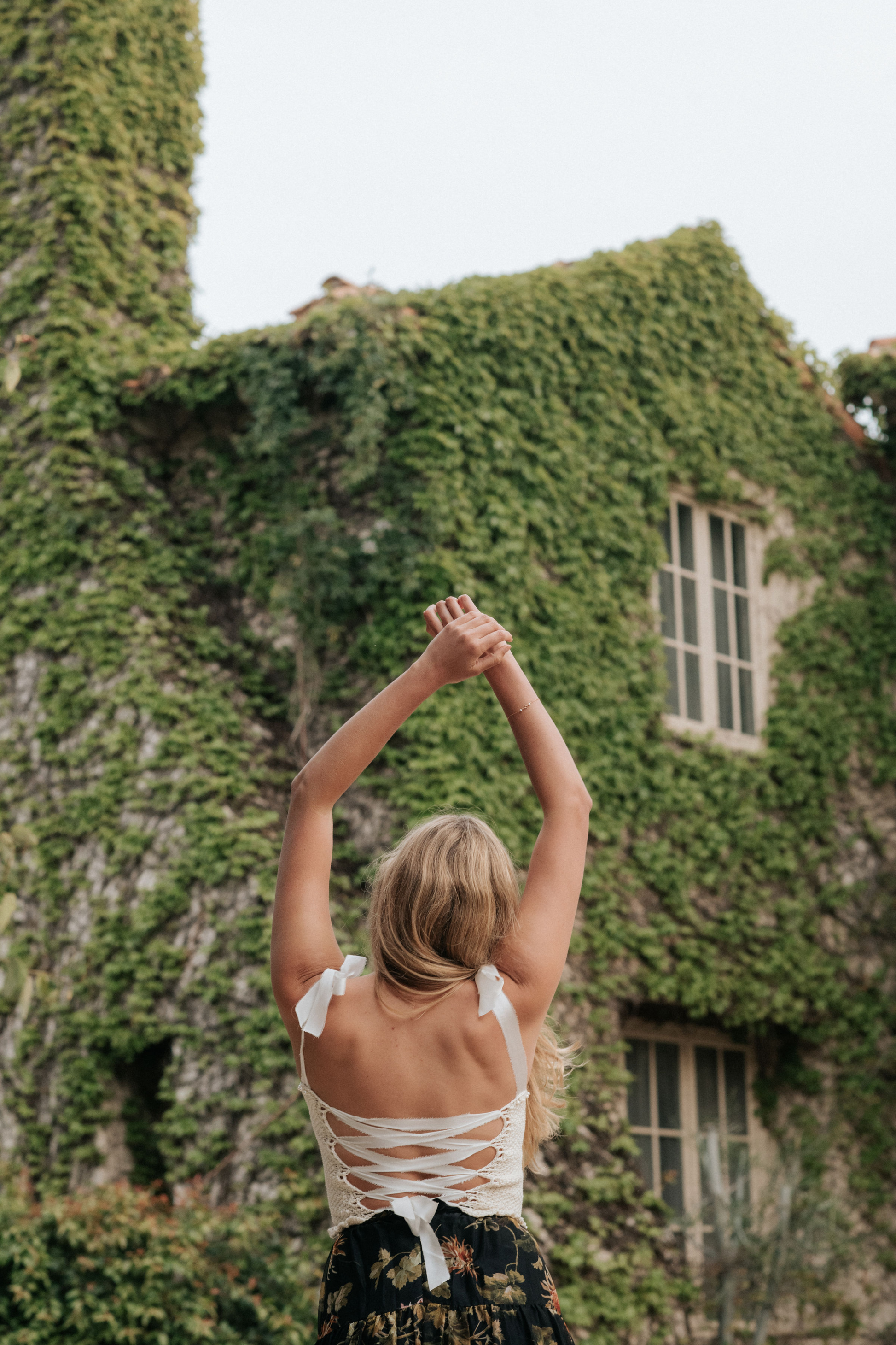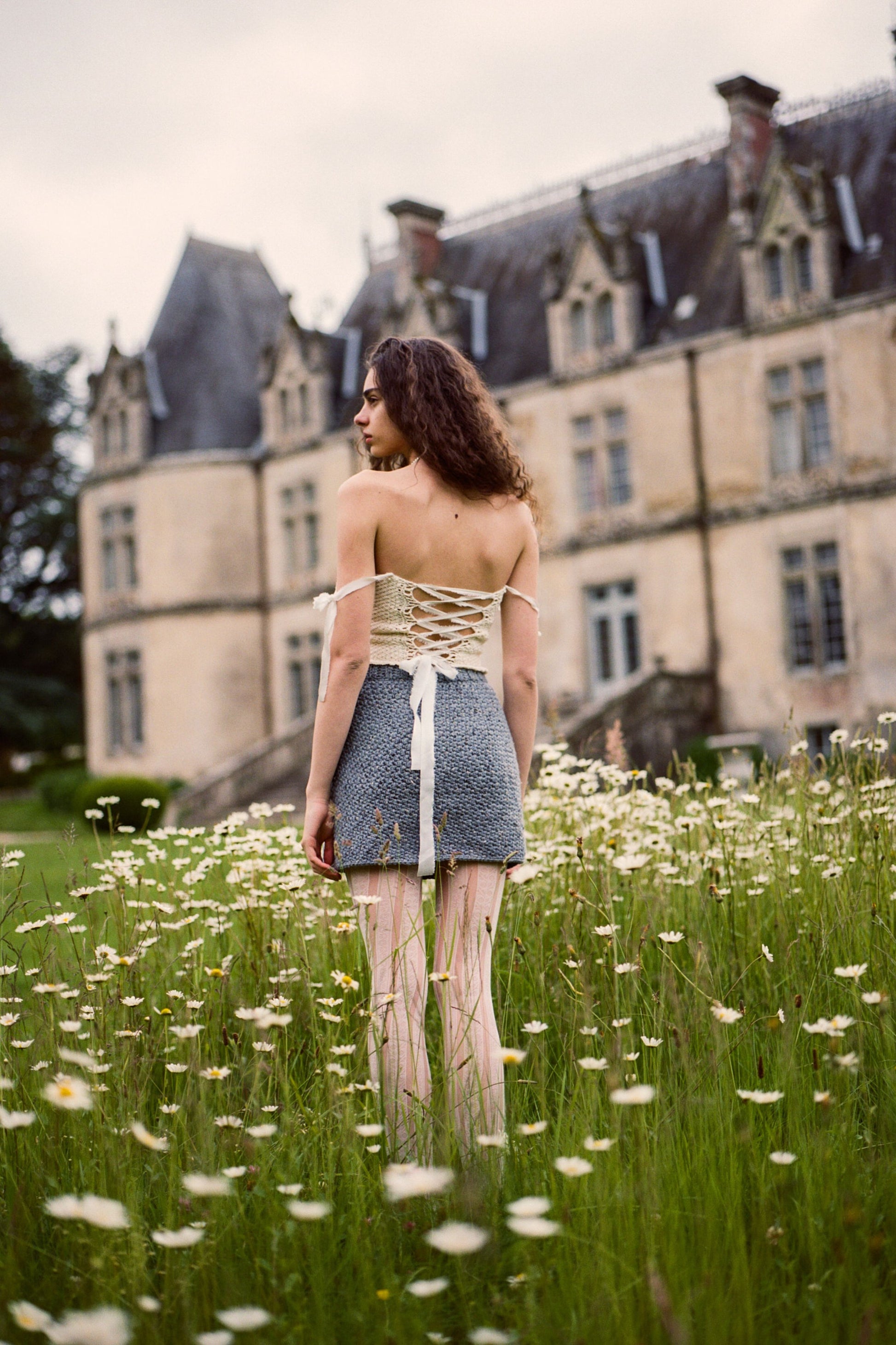 Le haut Belladonna est doté de bretelles et de rubans en charmeuse 100 % soie pour le dos du corset ajustable.