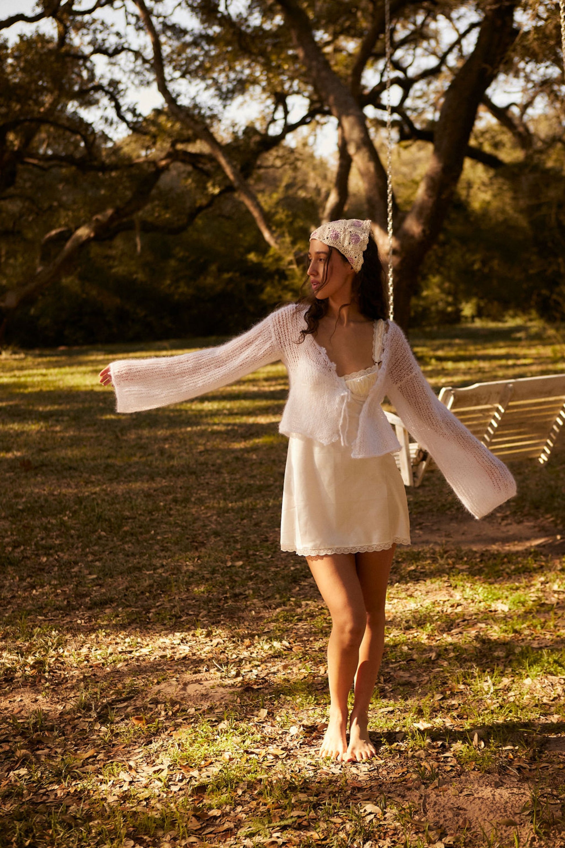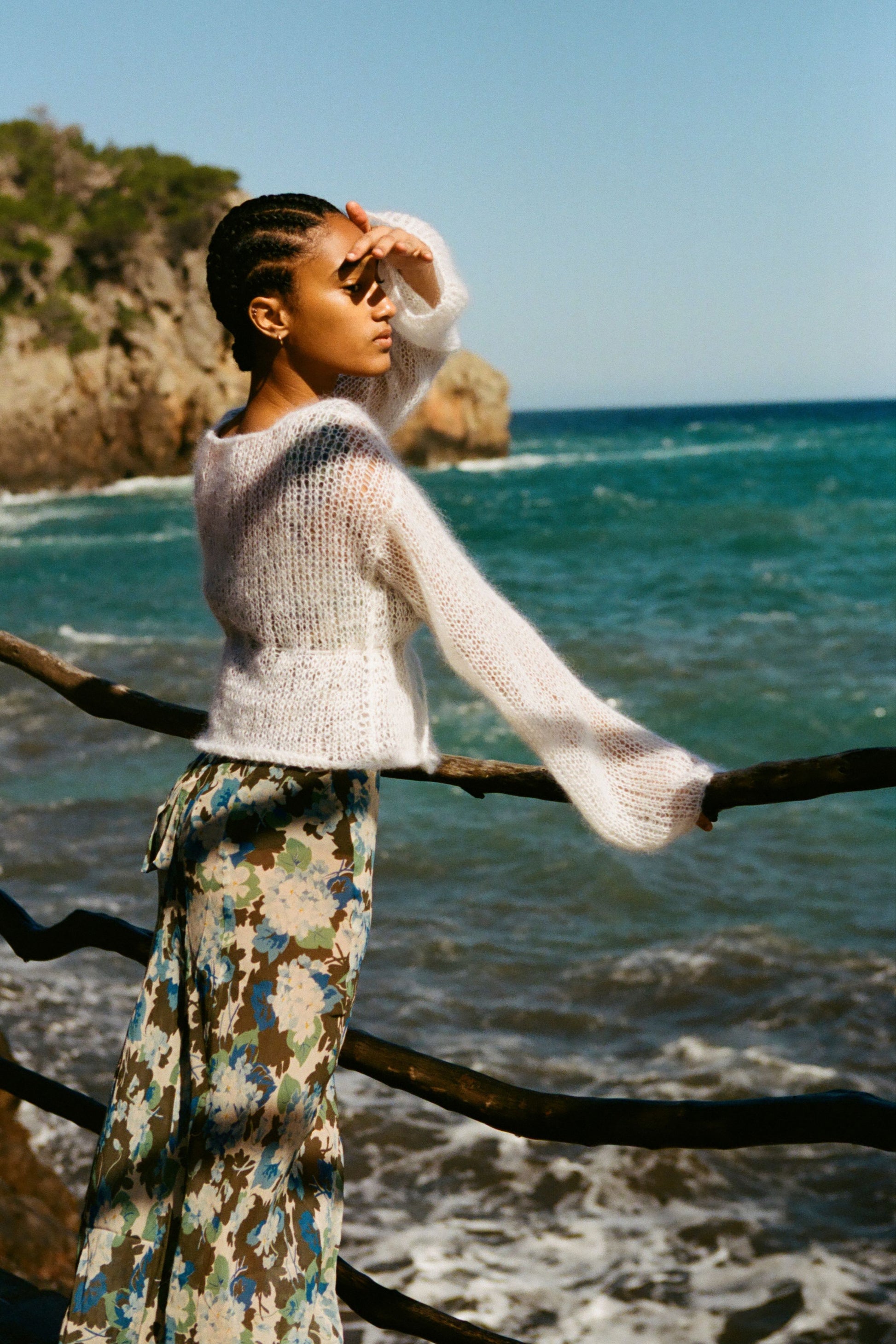 The Morning Glory sweater is an ever-delicate layer, handknitted with fine mohair and silk, offering a dimensional semi-sheer look. The Morning Glory has a relaxed fit with oversized sleeves and features a floral trim, an ode to the garden.