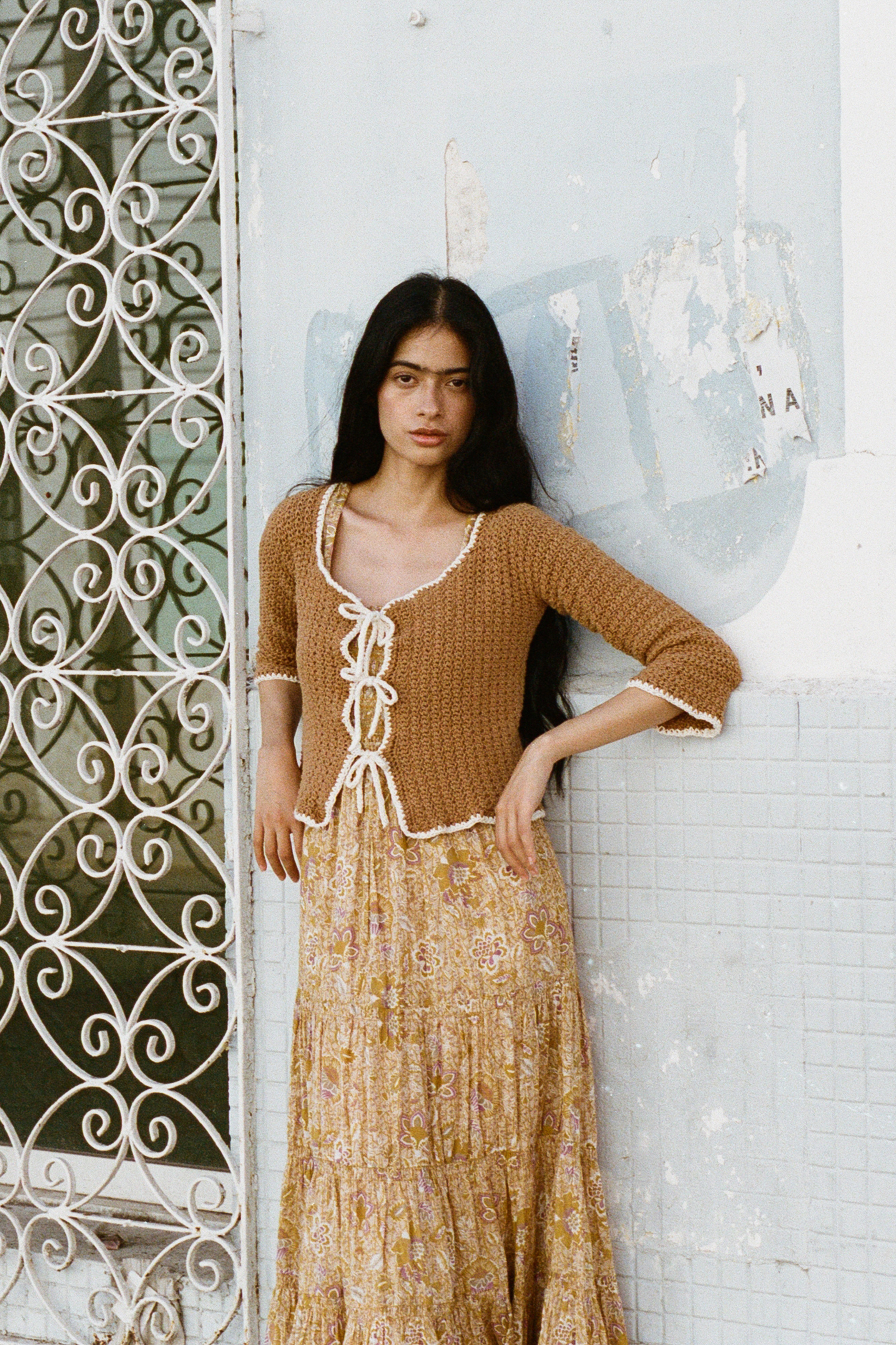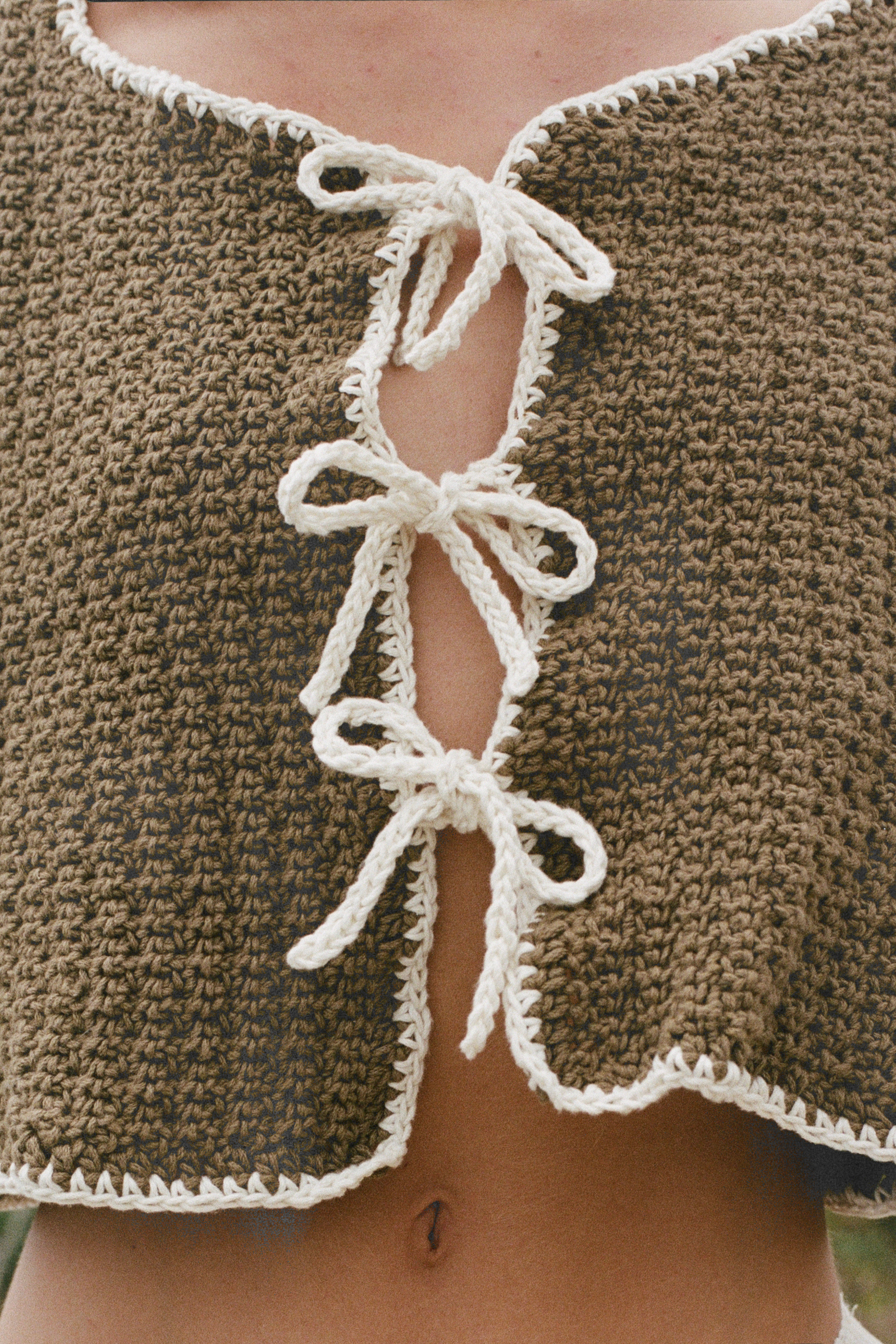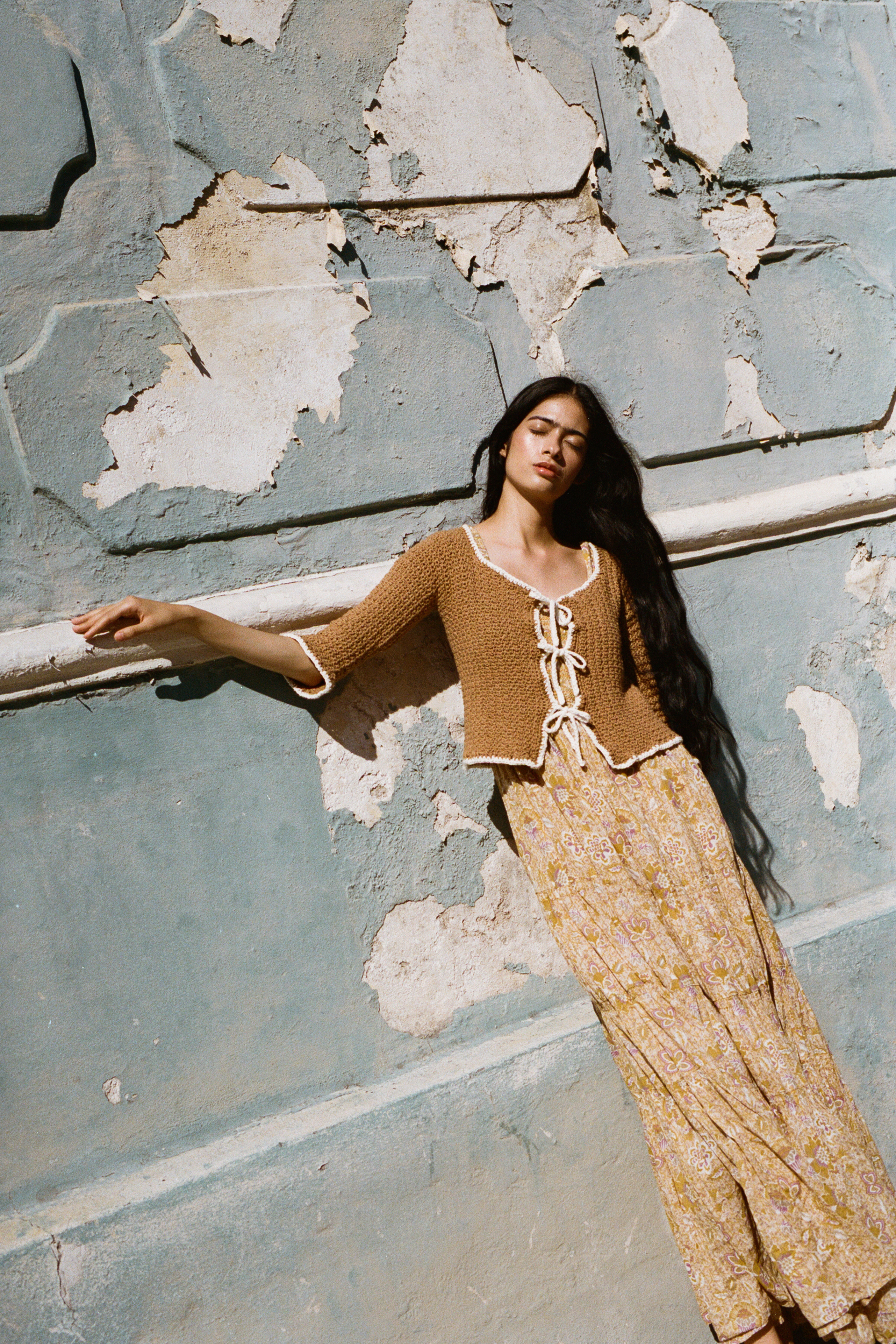 Available in two colourways of naturally pigmented cotton: Nettle, an earthy deep green, and Cinnamon bark, a natural terracotta. Features a white blanket stitch trim and three bows, blending vintage details with a modern silhouette.