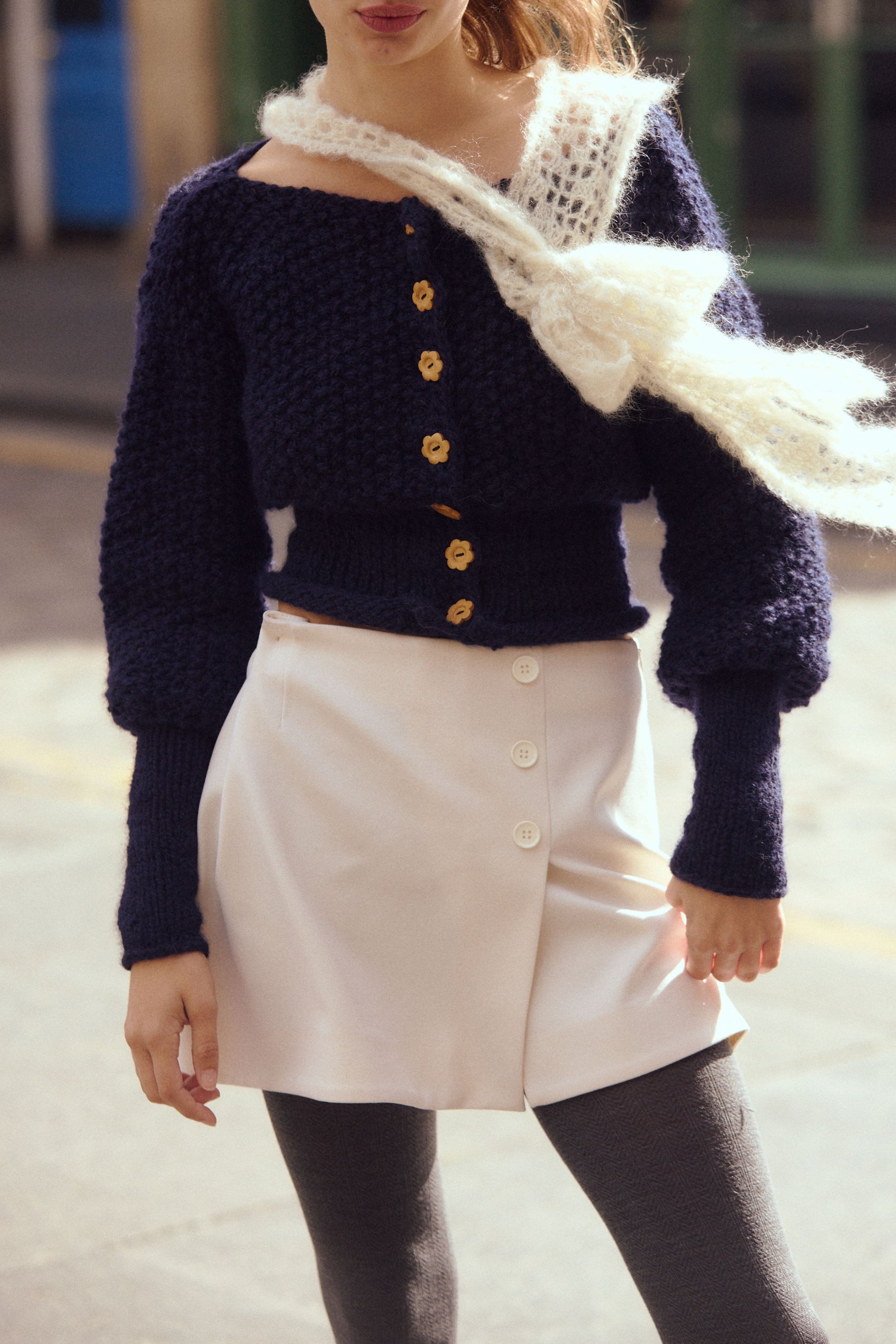 A perfectly tailored cardigan offering the most flattering fit. With dramatic sleeves, a boat neck, and fitted waist, with intricately textured stitching. Accented by charming wooden buttons shaped like flowers.